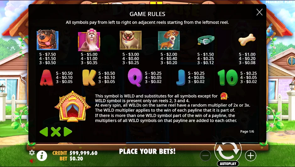 Es gibt 6 Symbole mit hohem Wert, nämlich die Hunde und einige Hundezubehörteile, und 5 Symbole mit niedrigerem Wert. Das sind die Spielkartensymbole. Ein Minimum von 3 Symbolen auf einer Gewinnlinie bringt Ihnen einen Gewinn. Es gibt auch die Autoplay-Funktion, die Sie verwenden können, damit sich die Walzen automatisch drehen. Achten Sie aber darauf, dass Sie vor Ihrem Spielanfangen unbedingt das passende online Casino The Dog House finden sollen. Darüber aber erfahren Sie weiter.